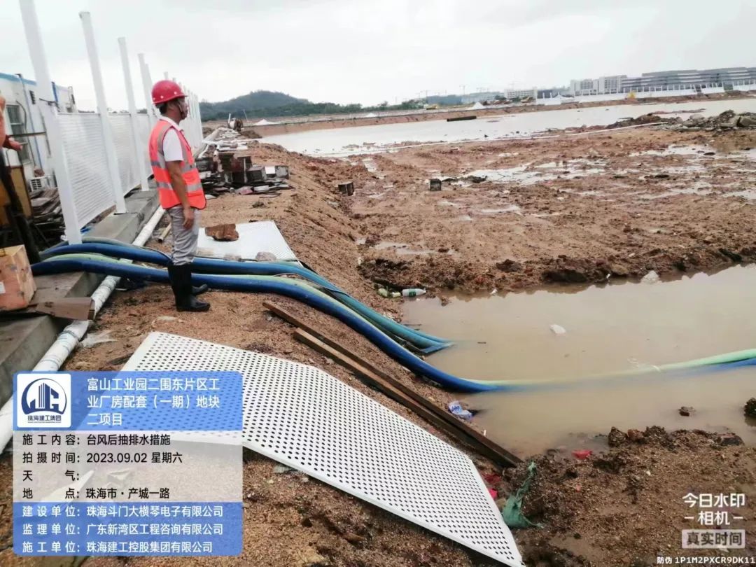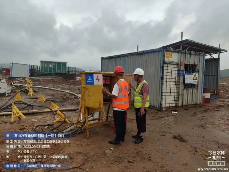 在斗门C币钱包 5.0产业新空间万锂新材料(一期)项目现场,开展了台风后复工复产安全大检查,现场组织排水、围挡修复各项工作。