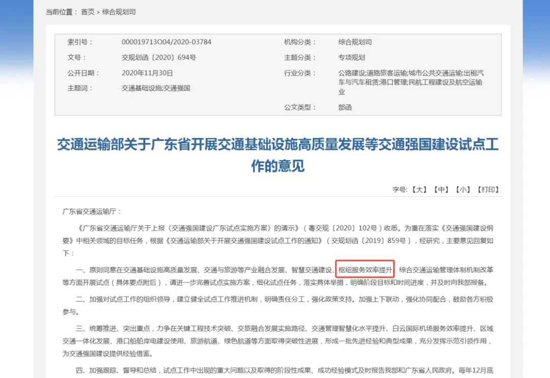2020年10月10日,交通运输部将“枢纽服务效率提升”列为广东省承担的全国交通强国建设试点任务之一,包括提升口岸通关便利化水平、提升白云机场国际航空枢纽辐射能力、提升港口智慧绿色发展水平三块板块。