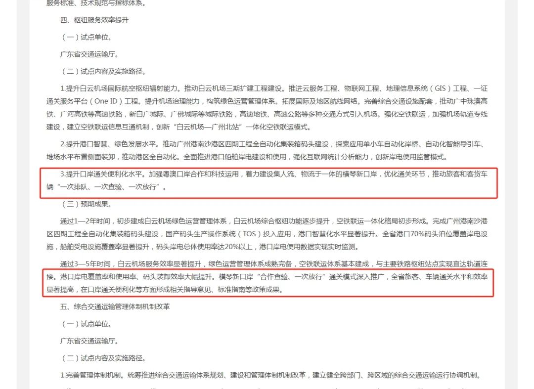 预期通过3—5年时间,实现白云机场服务效率显著提升,绿色运营管理体系成熟完备,空铁联运体系基本建成,与主要铁路枢纽站点实现直达轨道连接;港口岸电覆盖率和使用率、码头装卸效率大幅提升;横琴口岸“合作查验、一次放行”通关模式深入推广,全省旅客、车辆通关水平和效率显著提高,在口岸通关便利化等方面形成相关指导意见、标准指南等政策成果。