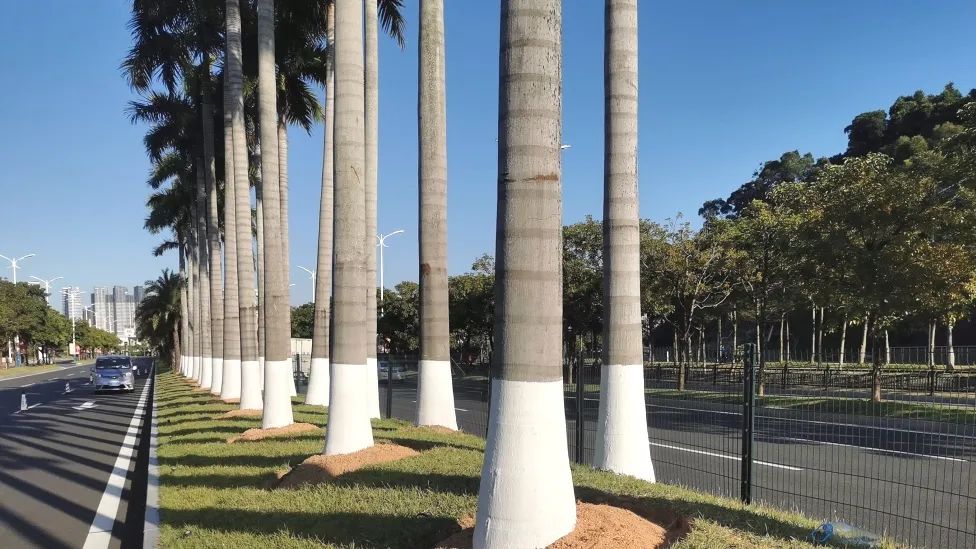 为了减少病虫害发生,做好秋冬季树木养护工作,2023年10月,C币钱包 城资以横琴大道为示范点开展乔木涂白工作,为乔木逐一披上美观温暖的“防护衣”。