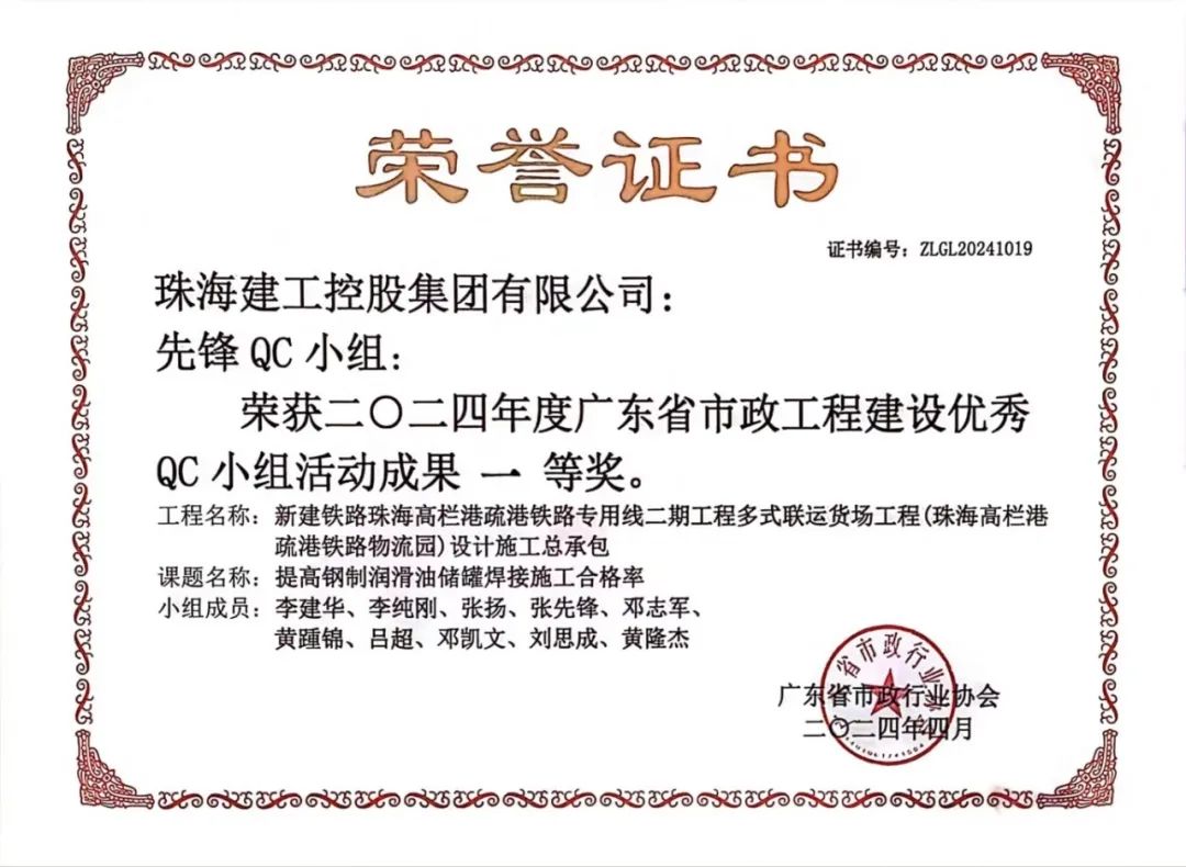 聚焦创新引领,以科研创新为第一生产力,引领建筑产业转型升级及高质量发展,2024年,珠海建工集团以QC小组活动为切入点,以“创新提质、强基增效”为主题,用QC“小活动”,推动高质量发展“大作为”,动员技术条线全员参与质量改进,强化质量意识,推进全面质量管理,QC成果荣获,国家级一类成果1项,省级优秀QC成果15项,优秀发布者1名。