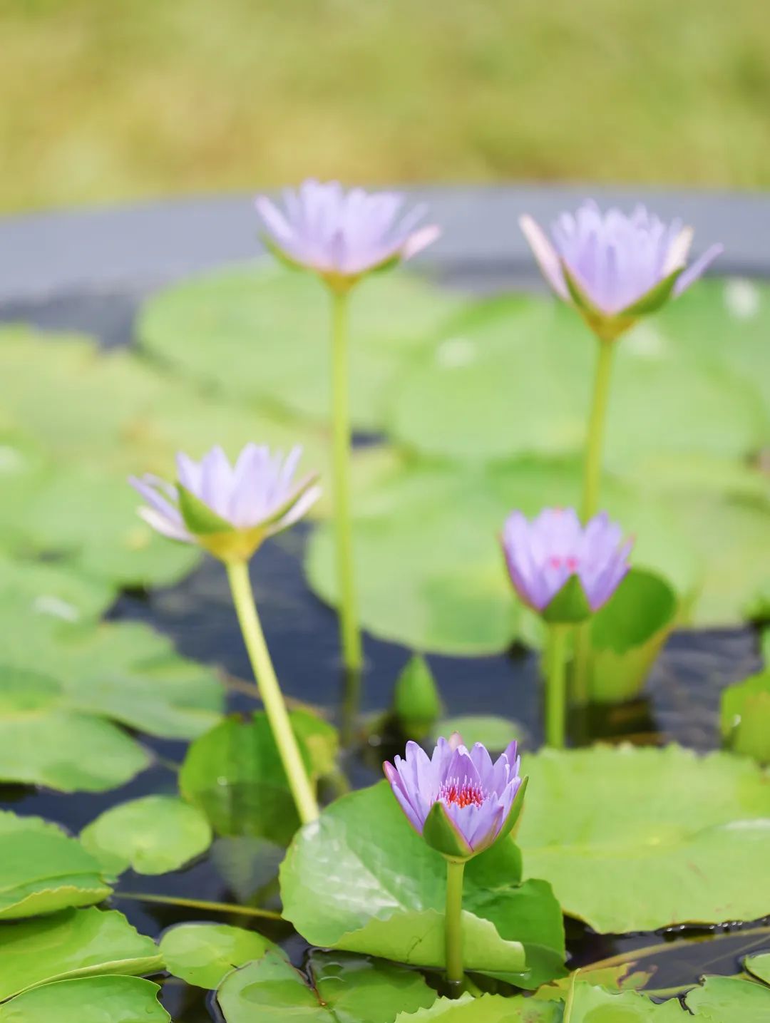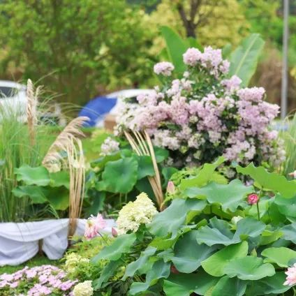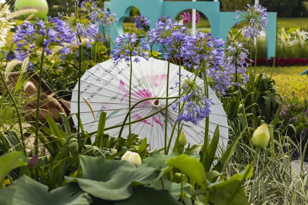 展园整体以典雅氛围为基调,白荷花与蓝紫色的百子莲则为点睛之笔,形成视觉焦点,现代素材与传统意境相互碰撞,打造清新与浪漫的场景。