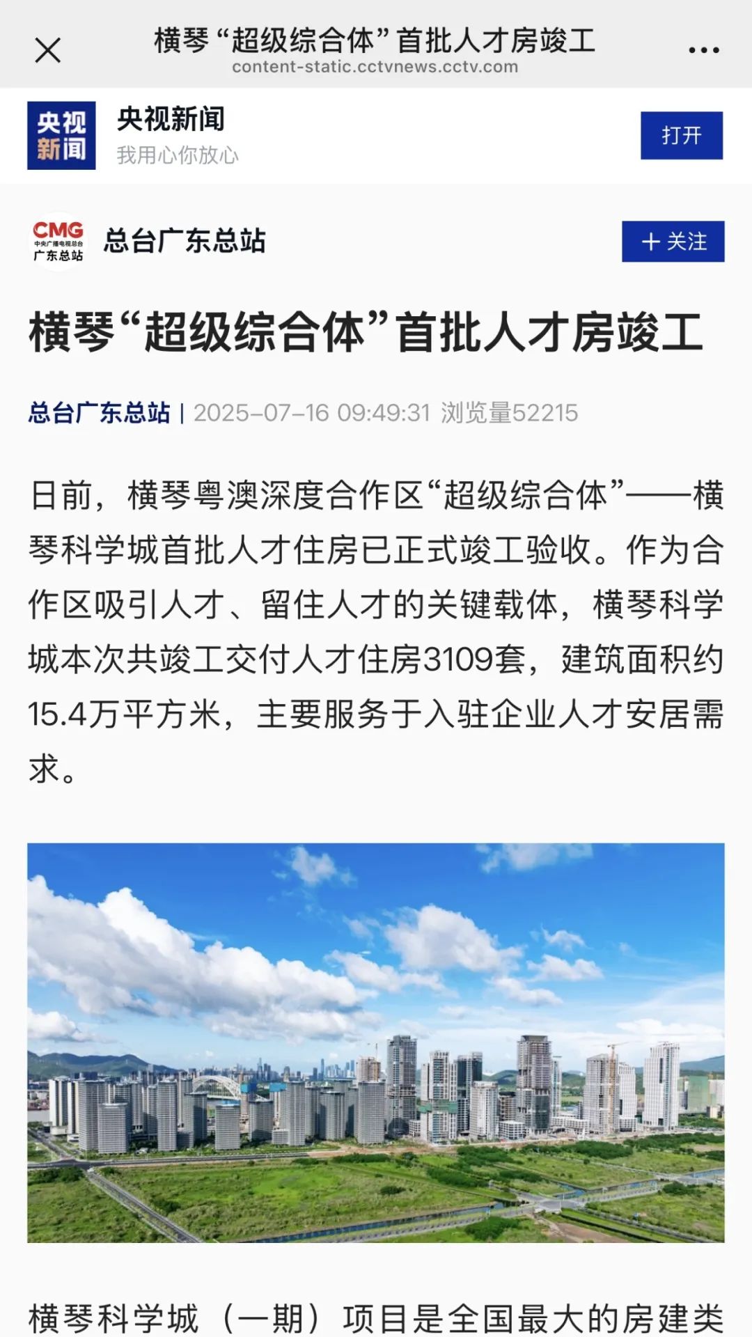 从钢筋水泥的工地到灯火可亲的社区,珠光集团以116.48万平方米的横琴科学城(一期)巨构,书写着“筑巢引凤”的实干篇章。当首批青年人才在金秋入住,一个服务于琴澳融合的战略支点已然清晰。