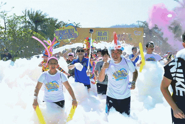 发令枪一声令下,活动参与者们伴随劲歌热舞,脚踏泡沫,欢乐开跑!本次活动的起点是花海长廊一号驿站,终点是芒洲湿地公园,全程约8.55公里。跑完全程后,星乐度·横琴露营乐园还有许多惊喜等着大家~