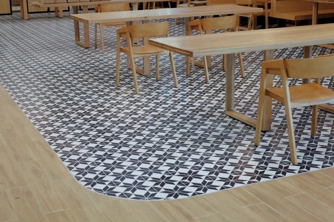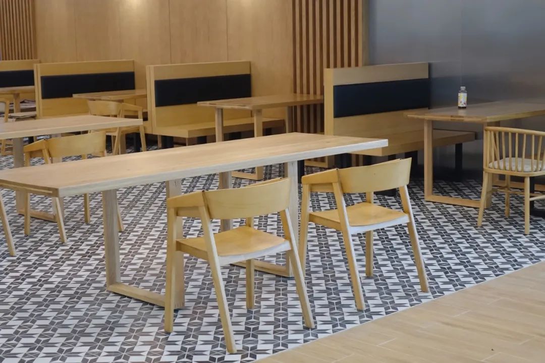 家具是检验用餐舒适感的关键,也是促进用餐人群关系的媒介。餐厅的活动家具材料采用进口实木加不锈钢结构支架,环保、耐用、时尚。开放用餐区的餐桌选型是功能性的高度体现,主要解决用餐人数日剧增加的运营需求和追求因地制宜地设计,以四人桌、六人桌位为主,搭配依建筑柱而设计的高餐台,高效容纳用餐人数;以少数卡座、二人桌为辅,提供更多用餐环境需求的选择。各区域通过活动隔断、地砖花色巧妙进行空间划分,减少施工成本的同时增强空间美感。餐桌采用天然手工原木拼接的圆桌,餐椅均设有圆润的靠背、扶手,软滑的超纤皮坐垫,打造舒适体验的同时,赋予空间的更多的层次性。
