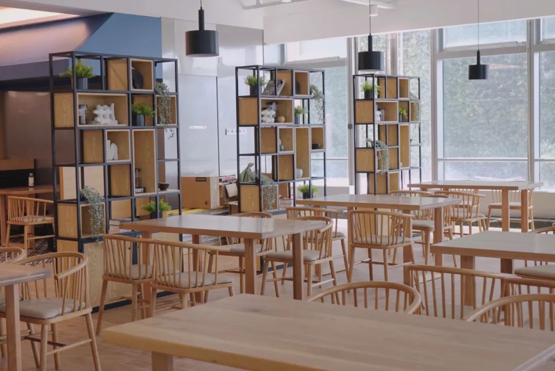 餐厅内部装修精致,环境简洁明快,就餐动线设计科学合理,空间划分为取餐区、用餐区、餐具回收清理区及后厨,实现就餐体验和就餐时间的双提升。