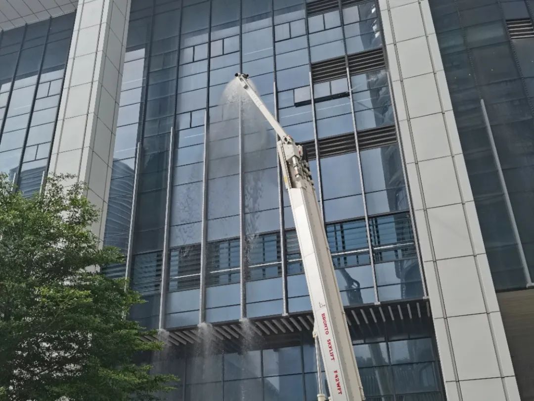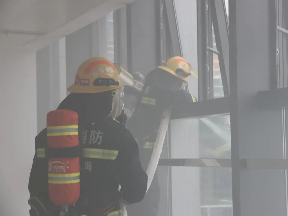 (6)横琴消防救援大队——使用高空水泡消防车对现场失火楼层位置进行高空喷水;横琴消防救援大队与灭火行动组里应外合,形成合围之势,将“火灾现场”进行处置;