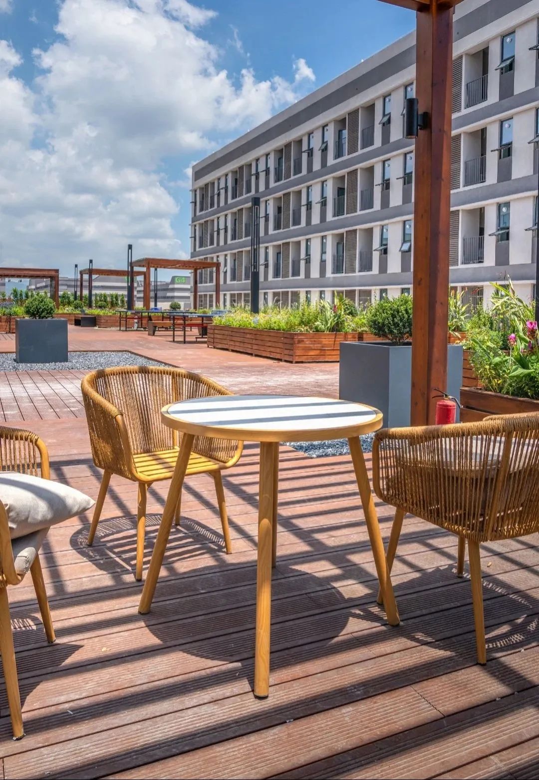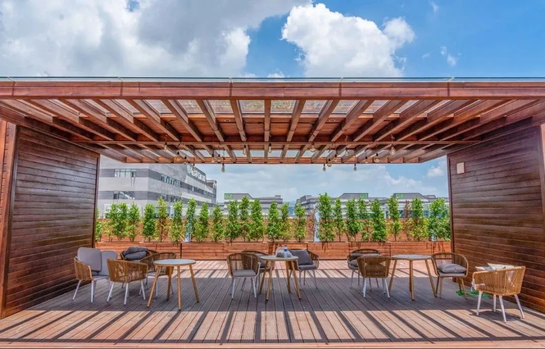 公共服务中心三层平台设置了屋顶花园,形成半开放式创新社区。考虑到公共服务中心宿舍的分布,屋顶花园位于两侧宿舍动线中轴。